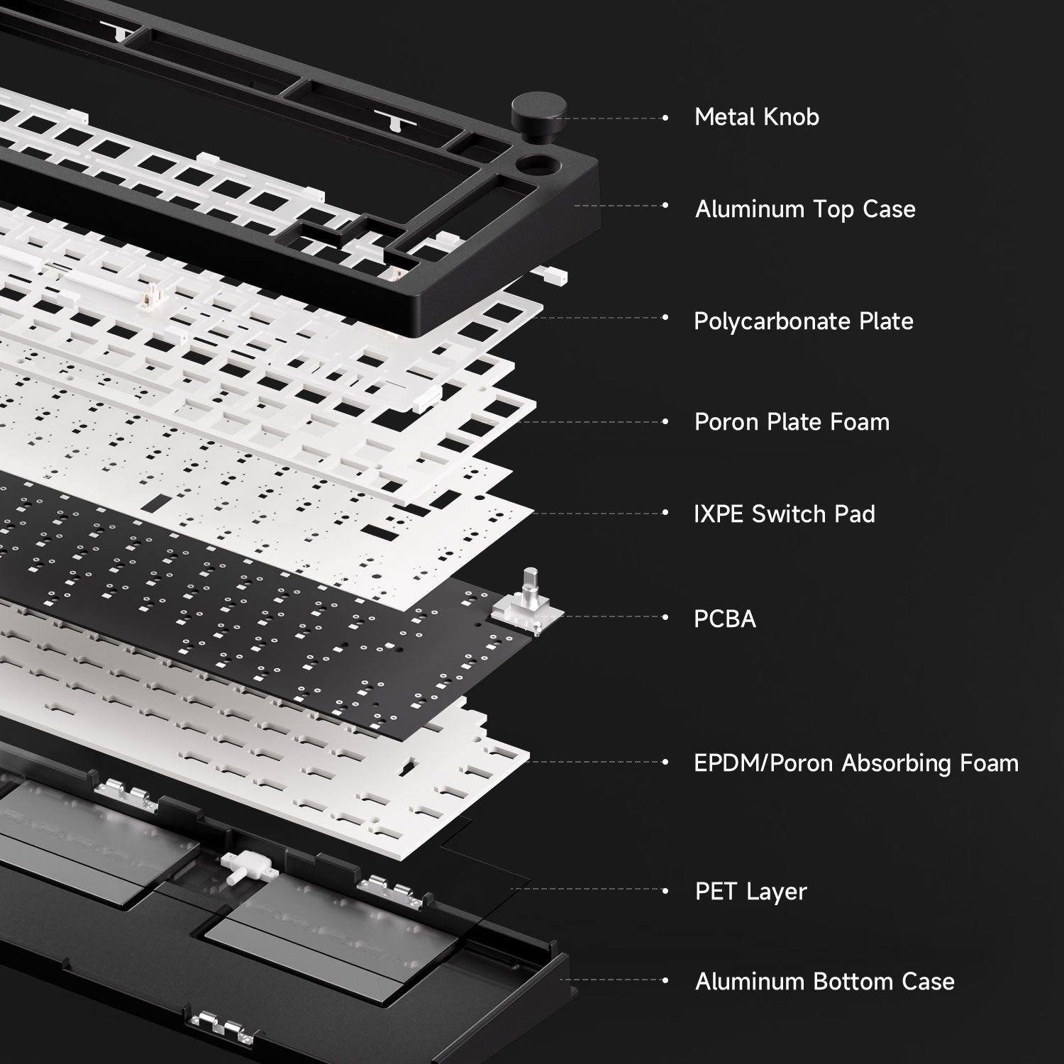 MonsGeek M1 V5 VIA DIY Kit is equipped with PORON plate foam, effectively reducing the noise generated by key switches, ensuring a purer and more comfortable tactile sound experience for the keyboard.